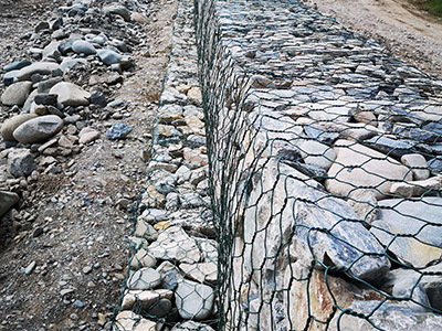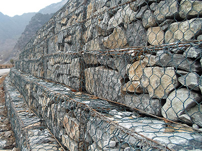 石笼网由高抗腐蚀、高强度、具有延展性的低碳钢丝或者包覆PVC的以上钢丝使用机械编织而成,使用该网制作而成的箱型结构就是石笼网箱。根据ASTM和EN标准,所使用的低碳钢丝直径根据工程设计要求而不同。一般介于2.0-4.0mm之间,石笼网钢丝的抗拉强度不少于38kg/m2,金属镀层重量一般高于245g/m2,石笼网片的边缘线直径一般要大于网线直径。其双线绞合部分的长度不得小于50mm.以保证绞合部分钢丝的金属镀层和PVC镀层不受破坏。