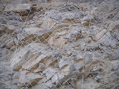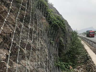 主动防护网是以钢丝绳网为主的各类柔性网覆盖包裹在所需防护斜坡或岩石上,限制坡面岩石土体的风化剥落或破坏以及危岩崩塌,将落石控制于一定运动范围内以保护行人和车辆安全通过的防护工具。