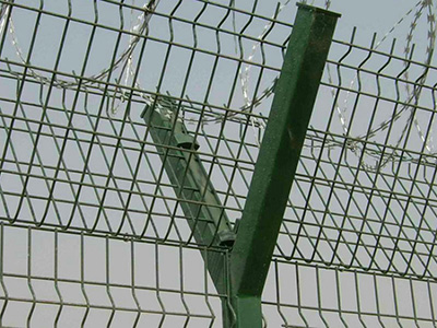 机场护栏网又称作“Y型安全防御护网”,是由V型支架立柱加强型焊接片网,安全防盗连接件和热镀锌刀片刺网组成强度和安全防御性级别很高。被广泛应用在机场,军事基地等高安全场所。